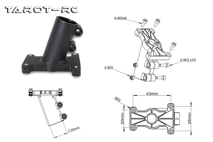 Tarot新款20mm脚架、电池板抱管固定座,采用复合材料一体成型,具有很好的刚性,整体质量轻且坚固耐用。适配Tarot新款四旋翼TL680A/TL680B机架,DIY玩家可根据尺寸图自行开孔安装。