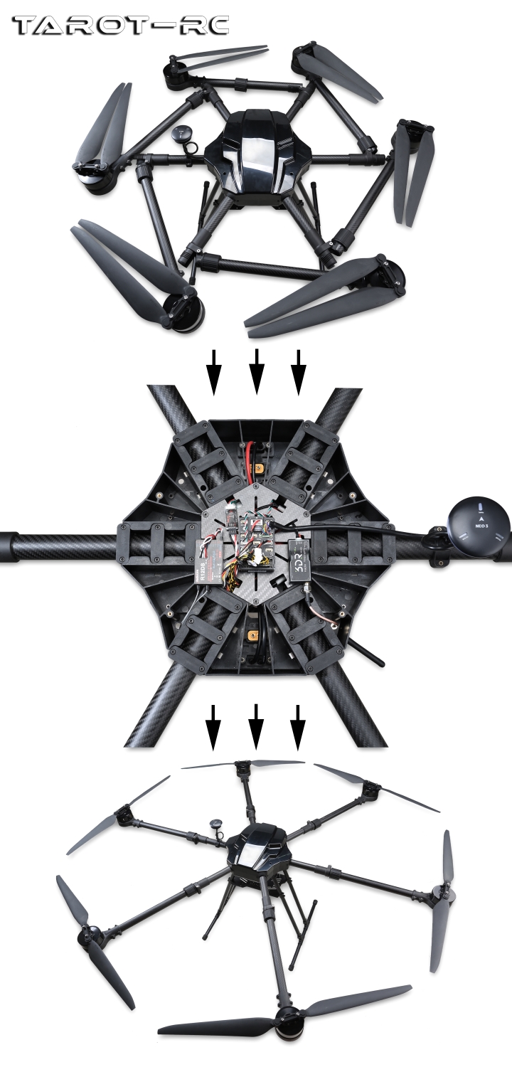 Product Description: ·Tarot's newest hexacopter multi-rotor drone frame, specifically designed for medium-sized IV training instructors; ·Wheelbase: 1600mm Compatible with commonly available tripods, microphones, projectors, and other equipment; ·Suitable for applications demanding high mobility, such as surveillance, remote sensing, surveying and mapping, aerial reconnaissance, fire observation, life exploration, cable inspection, farm monitoring, and more.