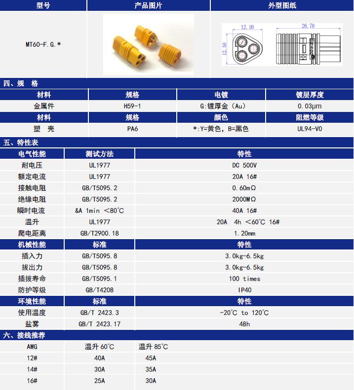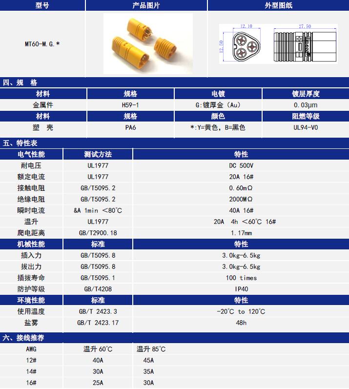 Amass三芯MT60适用于三条线同时连接的三芯接法,使用安全、方便,布线整齐。(例如电调和电机之间的连接,极大的方便了使用。)为了安全方面考虑,本插头采用紧配设计.防止飞行期间松动.