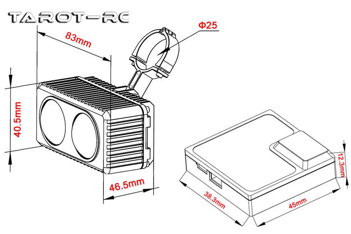 Tarot出品的无级探照灯,采用双灯珠组件,照射角度35度,在最大功率50W工作时会产生8000Lux,50米距离的光斑中心照度值达8.5Lux;在50米的照射高度下有效照射面积达910平方米。此款探照灯采用PWM信号控制无级调光、爆闪功能。整体采用超轻量设计,重量203g,可安装于管径为25mm的机臂或脚架上,可满足夜晚巡查、警告驱离、方位指示、电力巡线、搜索救援等夜间作业需求。