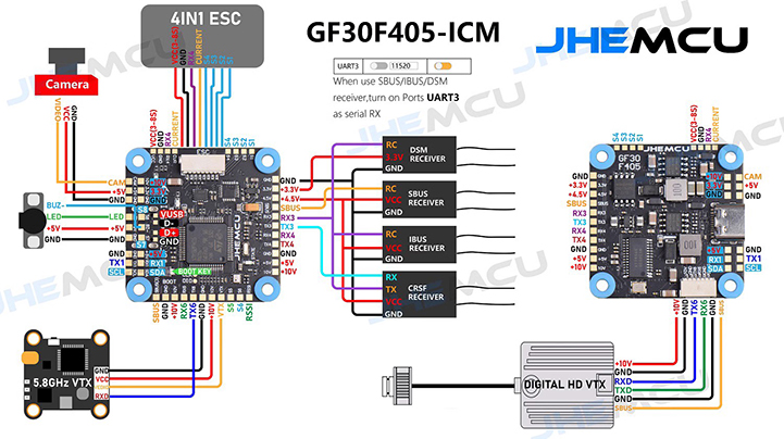 JHEMCU出厂的迷你F405飞控,支持3-8S电压输入,ICM-42688-P传感器组件,支持OSD信息叠加,特别适合小型多轴旋翼飞行器以及FPV穿越机使用。