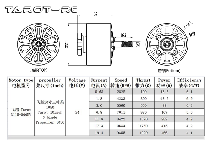 产品名称:Tarot 无刷电机/长续航高效率/FPV竞速马达/3115/900KV TL1616